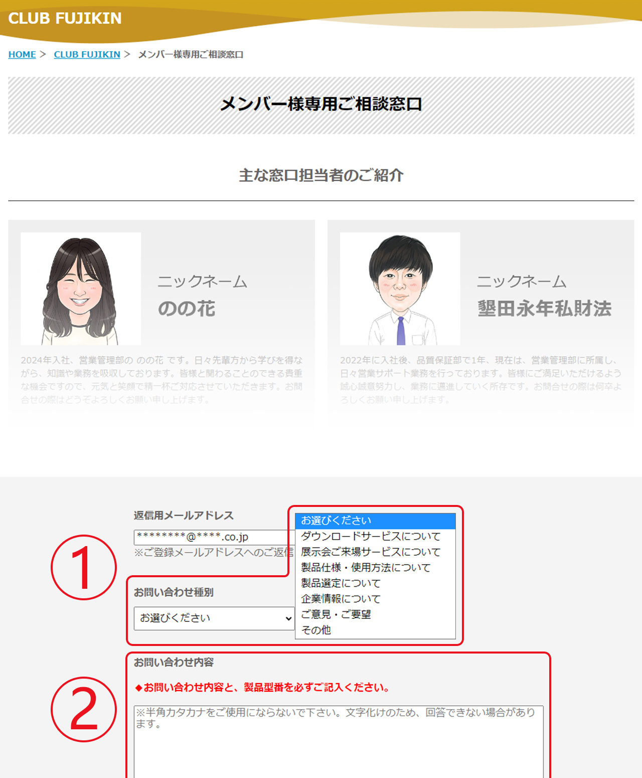 CLUB FUJIKINメンバー様専用窓口として、ご相談・お問い合わせフォームや専用フリーダイヤルをご用意しております。専任担当者とのコンタクトは下記、簡単2ステップ(①お問い合わせ種別を選ぶ ②お問い合わせ内容を入力する)のみ。