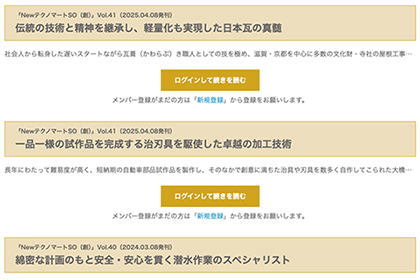 フジキンが発行する情報誌「NewテクノマートSO(創)」でご紹介させていただいた「名工」たちをピックアップして掲載しています。ものづくりに対する技術の高め方や想いなど「名工」たちから学べます。