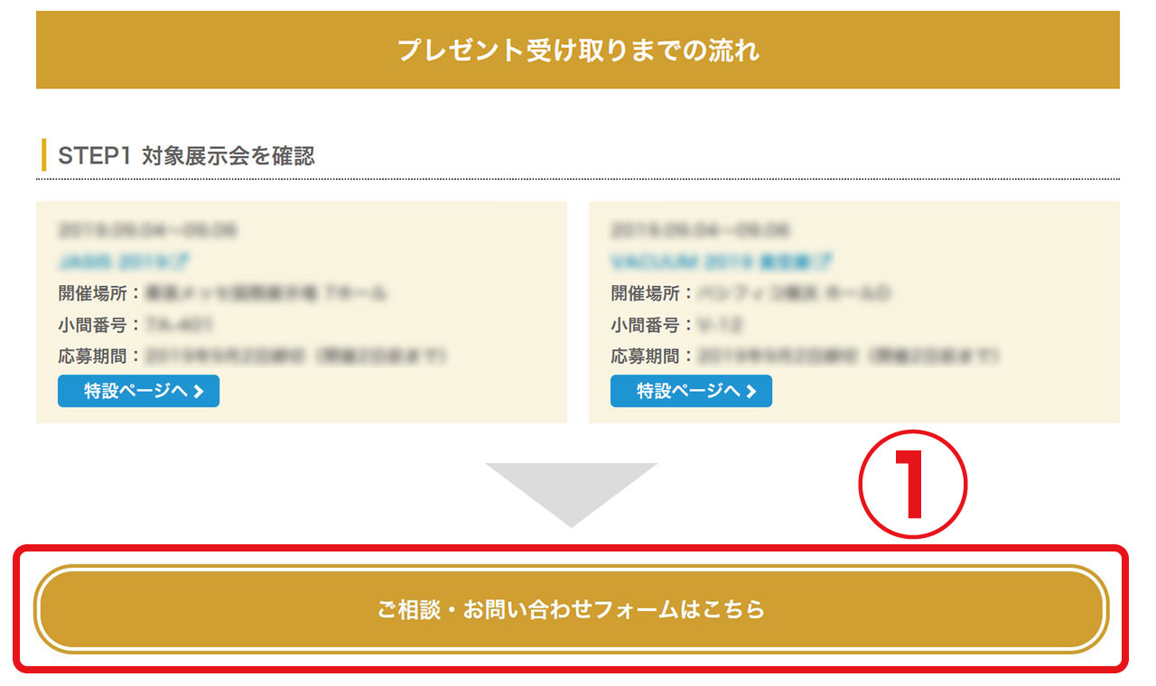 ① 展示会ご来場サービスページの対象展示会を確認し、ページ下部の『ご相談・お問い合わせフォームはこちら』ボタンを押してください。