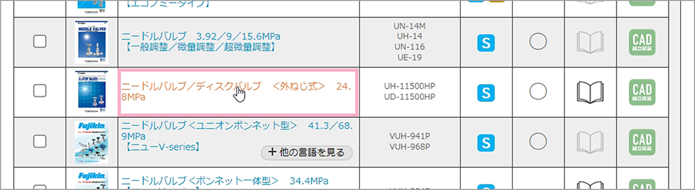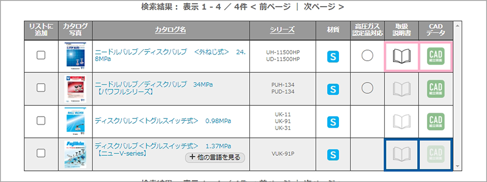 右列の「取扱説明書」「CADデータ」にアイコンが表示されている場合、アイコンをクリックすると対象データが表示されます。