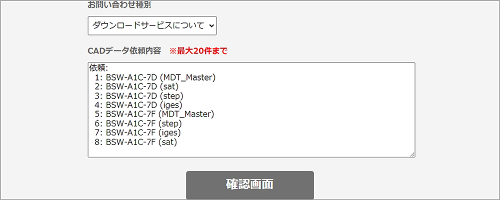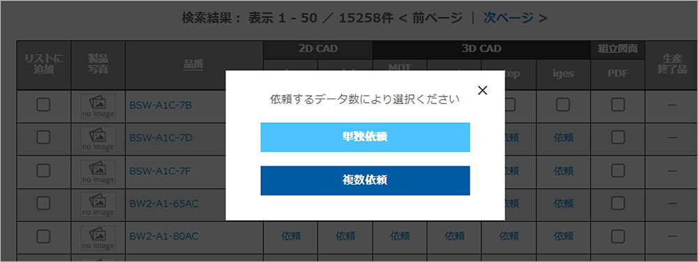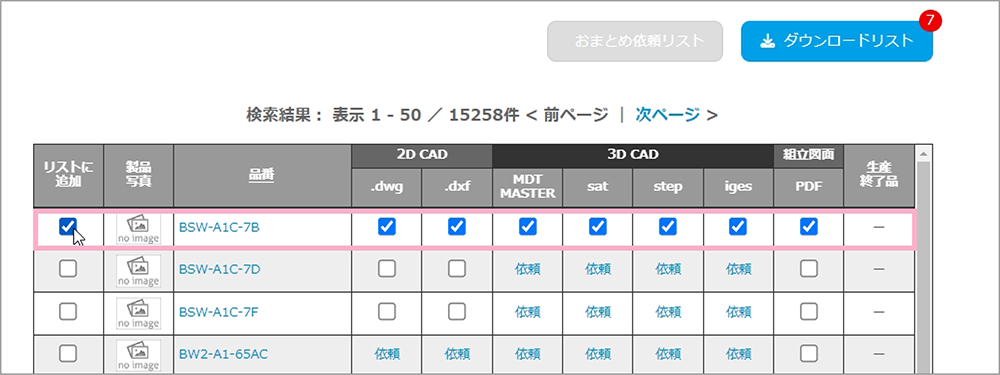 個別で選択する場合は、「品番」右に並ぶチェックボックスからご希望のファイル形式を選択してください。
