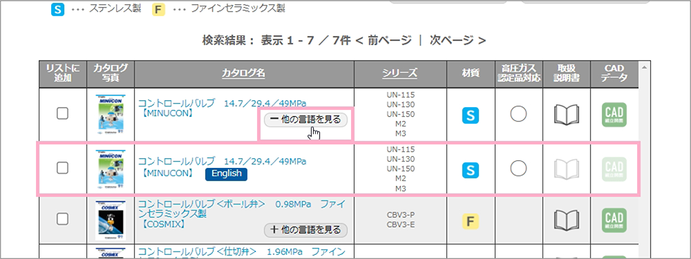 検索結果一覧にあるカタログ名に「+他の言語を見る」と表示されている場合は、クリックすると存在する他言語カタログがその下部に表示されます。