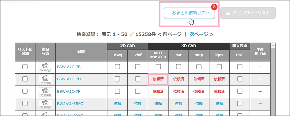 依頼される際は、「おまとめ依頼リスト」をクリックすると「CADデータおまとめ依頼リスト一覧」が表示されますので、内容をご確認のうえ、「おまとめ依頼フォームへ送信」を押してください。