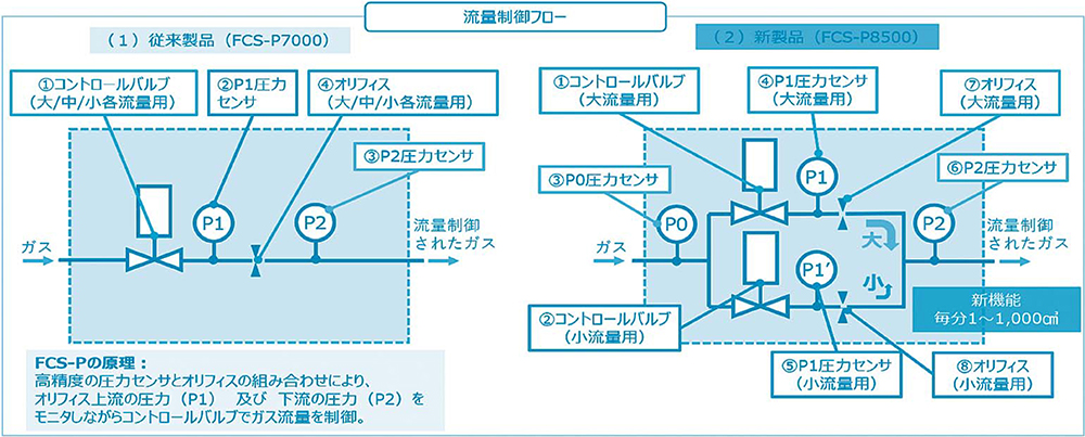 流量制御幅のユーザーニーズ(毎分1 ~ 1,000㎤)に応えるため、従来は3種のオリフィスとコントロールバルブを採用した個別の機種を組み合わせる必要がありました。毎分の制御幅1 ~ 10㎤、10 ~ 100㎤、100 ~1,000㎤の3機種です。今回の新製品FCS-P8500は、大小流量2 系統の流路を1 台に組み込むことで、1台で毎分1 ~ 1,000㎤のレンジアビリティを達成しました(図2)。